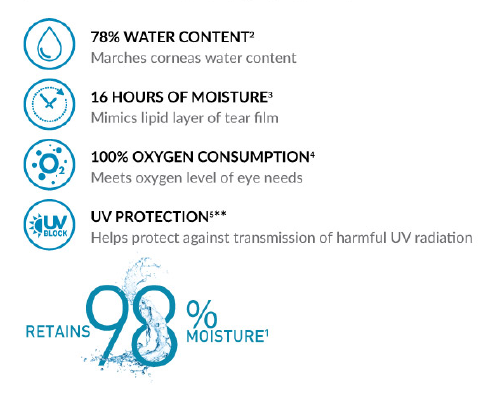 Biotrue®️ ONEday contact lens start and end the day with more moisture than leading daily disposables. They can maintain 98% of their moisture for up to 16 hours.